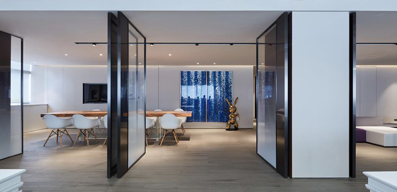3、固定隔断常用的分为:石膏板隔断、玻璃隔断两种。石膏板隔断使用率很高,常用于基本的房间分割,背景墙造型,除了通透感差、不利于房间采光这点以外,是最常用的分割空间的手段。想要透光性好一些可以用玻璃隔断,玻璃的透明度很高,在视觉上能有效提升开阔性,让办公室感觉更宽敞。