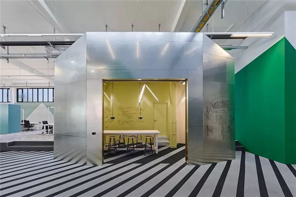 4、创意工业风汽车公司办公室装修设计:室内材质的选择遵从于汽车产业的工业属性。未加工锌板、天然木材和钢材表面共同构筑室内几何单元。有着半通透质感的聚碳酸酯材料板构筑了室内众多隔间墙体。聚碳酸酯与原木框架的结合,让这里呈现出建筑构造较初始的发展状态中。初始化工业风质感在强烈的色彩映衬下和时尚的家具点缀下,形成鲜明的质感对比,带来丰富的空间体验。近似黑白对比的条纹地毯,在空间中不断演绎着微妙的图形变化,带来精彩而时尚的视觉惊艳。